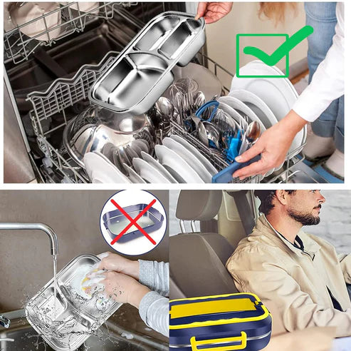 ✔ 3-Compartment Tray (visible in image) – Stainless steel design with separate food sections to keep meals organized and leak-free.